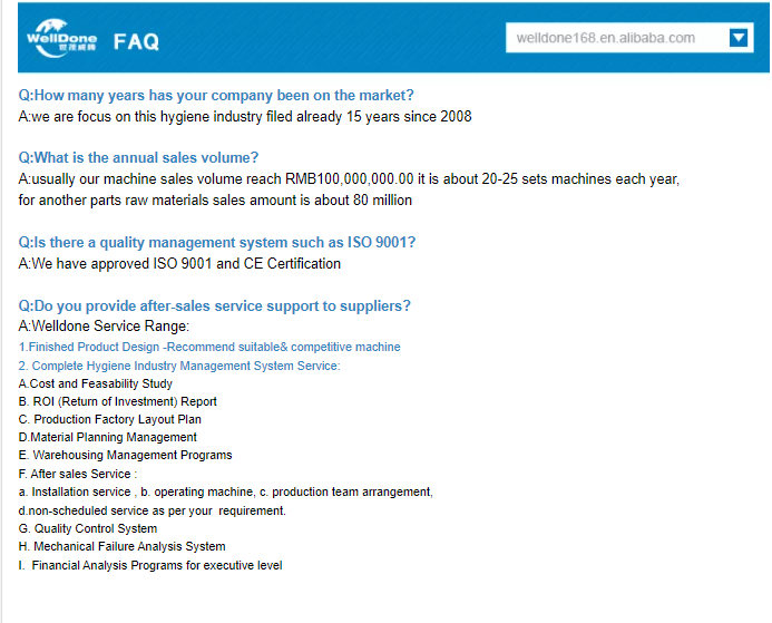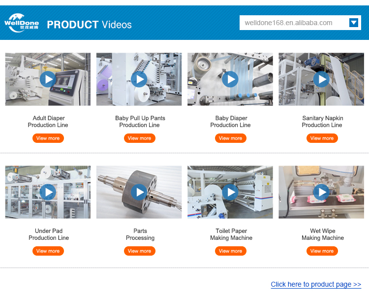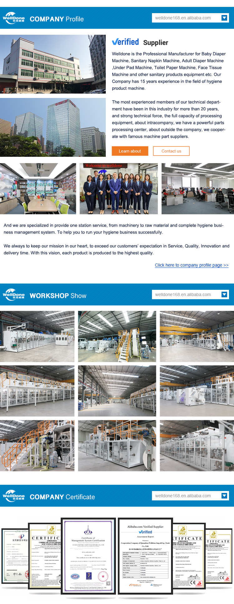 WELLDONE (CHINA)INDUSTRY LIMITED has been focusing on developing products regularly, of which baby diaper machine,adult diaper machine,sanitary pad machine,wet wipes machine,under pad machine,tissue paper machine is the newest. It is the newest series of our company and is expected to surprise you. Our I shape full automatic machines for the production of baby diapers made in Fujian raw material is pure and high quality providing best results and longer support throughout your use. To make us continue to thrive in the next decade and beyond, we must focus on improving our technology capabilities and gathering more talents in the industry. With our full efforts, WELLDONE (CHINA)INDUSTRY LIMITED believe that we will stay ahead of other competitors in the future.